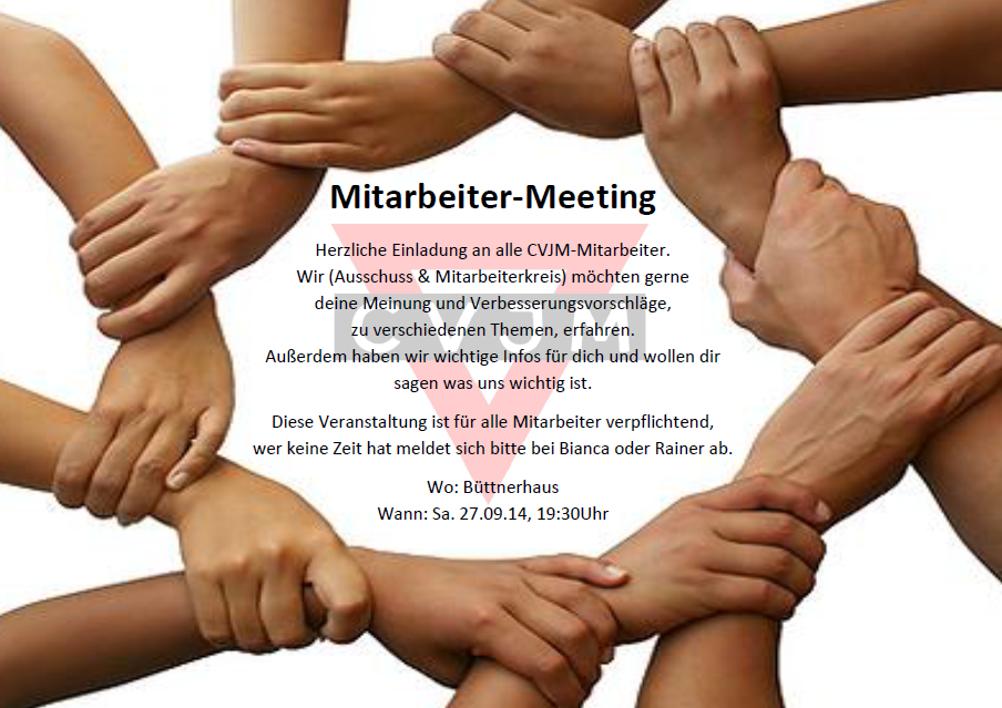 Mitarbeiter-Meeting am 27.09.2014 Herzliche Einladung zum Mitarbeiter-Meeting des CVJM Simmersfeld am 27.09.2014 im Büttnerhaus: